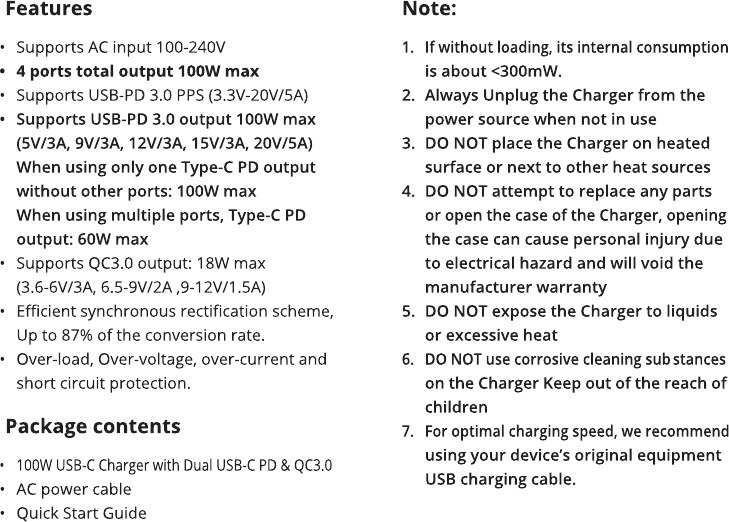 Features Supports AC Input 100-240V 4 ports total output 100W max Supports USB-PD 3.0 PPS Supports USB-PD 3.0 output 100W max {SV/3A, 9V/3A, 12V/3A, 15V/3A, 20V/5A) When using only one Type-C PD output without other ports: 100W max When using multiple ports, Type-C PD output: 60W max Supports QC3.0 output: 18W max Efficient synchronous rectification scheme, the conversion rate. Over-load, Over-voltage, over-current and short culture protection. Package contents 100W USB-C Charger with Dual USB-C PD &QC3.