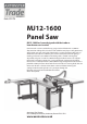 Code: 501198 MJ12-1600 Panel Saw MJ12-1600 has been designed with the trade or keen home user in mind. Constructed in cast iron, welded heavy gauge steel and fitted with a 1,600mm alloy extrusion sliding table, it is robust and stable for everyday use. The good sized, deep section cast iron main table is fitted with a cast iron extension table giving a combined surface of 825 x 800mm, plus a further steel plate extension giving a working surface of 1,265 x 800mm.