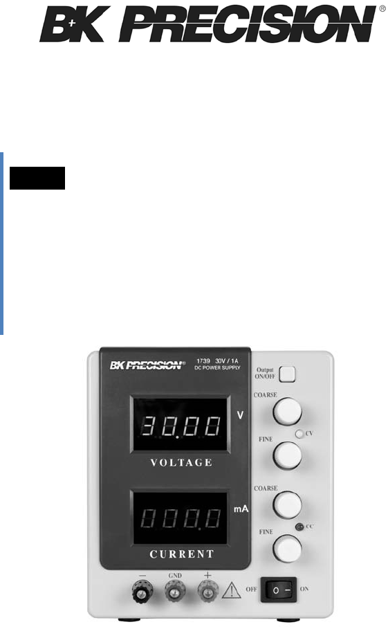2 Introduction Description The B&K Precision model 1739 is a high quality, low current DC power source. This power supply provides 0-30 volts dc output, adjustable with both coarse and fine voltage controls for precise settability. The current output is 0-1 amps, adjustable with both coarse and fine current controls. Two large LED meters continuously monitor the output voltage and current. The VOLTAGE meter is green, while the CURRENT meter is red.