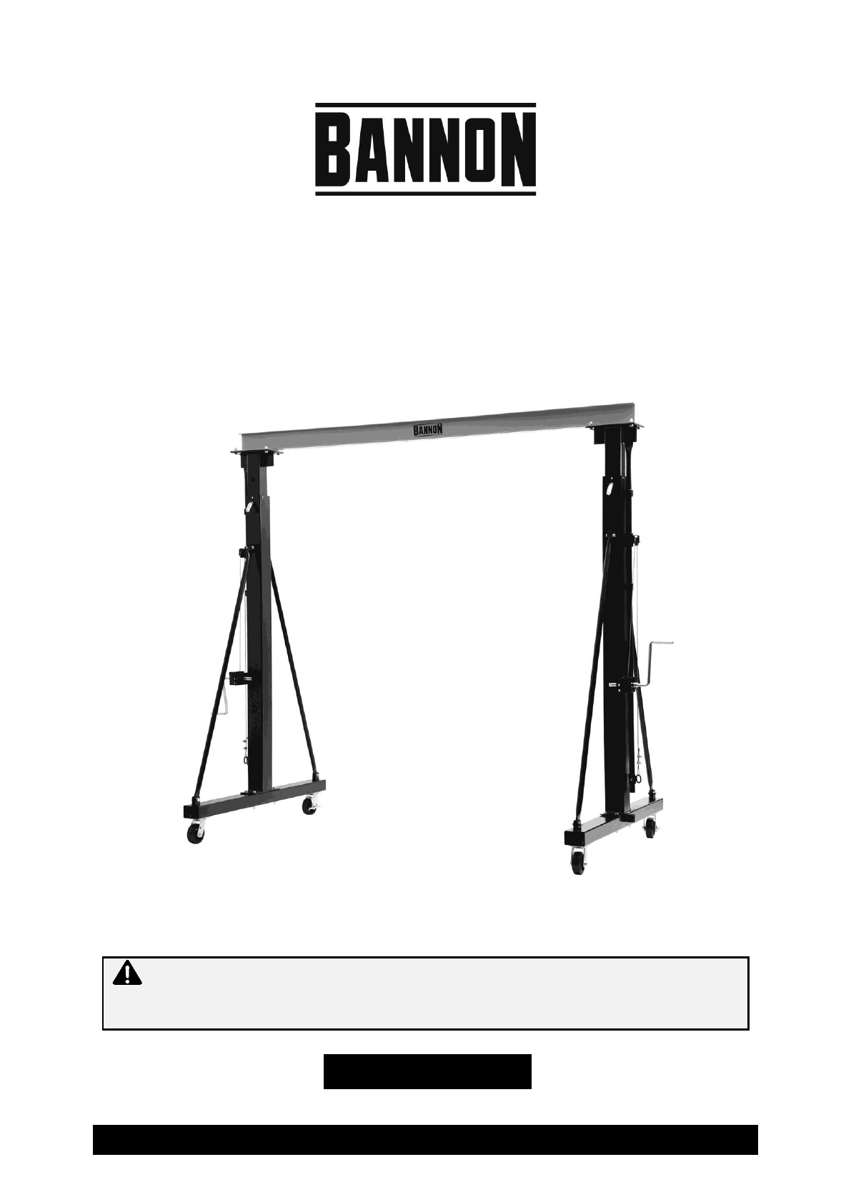 Thank you very much for choosing a Bannon™ product! For future reference, please complete the owner’s record below: Serial Number/Lot Date Code: ________________________________ Purchase Date: ____________________________________________ Save the receipt, warranty, and this manual. It is important that you read the entire manual to become familiar with this product before you begin using it. This gantry crane is designed for certain applications only.