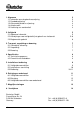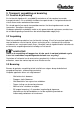 1. Algemeen 1.1 Informatie over de gebruiksaanwijzing 1.2 Symboolverklaring 1.3 Aansprakelijkheid en vrijwaring 1.4 Auteursrecht 1.5 Verklaring van conformiteit 3 3 3 4 4 4 2. Veiligheid 2.1 Algemene informatie 2.2 Aanwijzingen voor veiligheid bij het gebruik van het toestel 2.3 Reglementair gebruik 5 5 5-6 6 3. Transport, verpakking en bewaring 3.1 Controle bij aflevering 3.2 Verpakking 3.3 Bewaring 7 7 7 7 4. Specificaties 4.1 Technische gegevens 4.2 Overzicht van onderdelen 8 8 8 5.