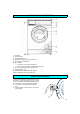 APPLIANCE AND ACCESSORIES 1. 2. 3. 4. 5. 6. Worktop. Control panel. Detergent dispenser. After-Sales Service sticker (inside door). Door with touch protection. Door handle. - to open the door: pull the handle out. - press the door firmly (the lock will click into place). 7. Door lock child safety device (inside door). 8. Filter (behind cover). 9. Residual water drain (behind the plinth). 10. Four adjustable feet (front and back).