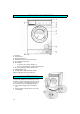 APPLIANCE AND ACCESSORIES 1. 2. 3. 4. 5. 6. Worktop. Control panel. Detergent dispenser. After-Sales Service sticker (inside door). Door with touch protection. Door handle. - to open the door: pull the handle out. - press the door firmly (the lock will click into place). 7. Door lock child safety device (inside door). 8. Filter (behind cover). 9. Residual water drain (behind the plinth). 10. Four adjustable feet (front and back).