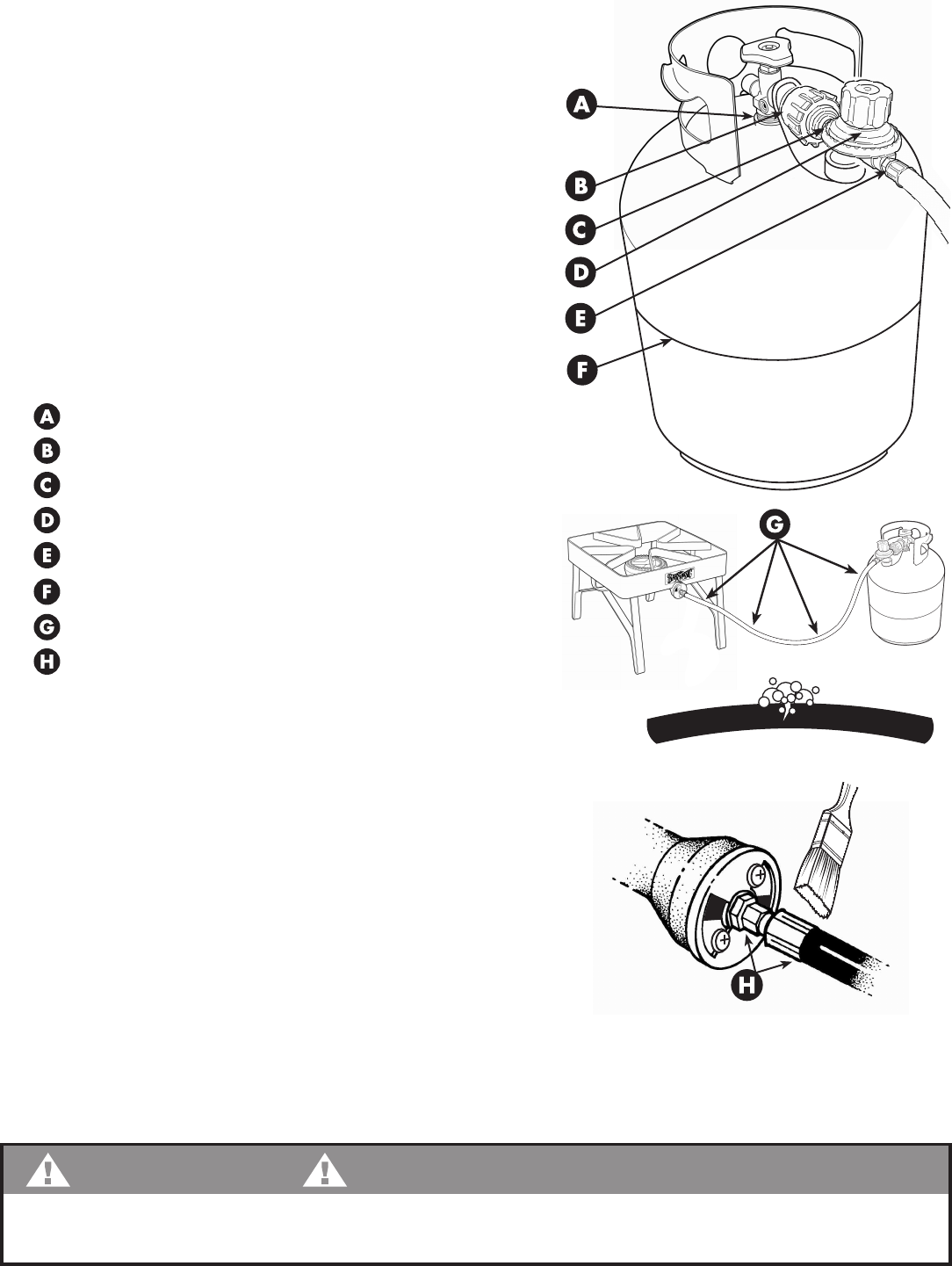 5. Check each place A - F for growing bubbles which indicates a leak.