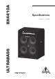 ULTRABASS BX4410A SPECIFICATIONS AUDIO INPUTS Active instrument input Input impedance Passive instrument input Input impedance Return Input impedance AUDIO OUTPUTS Send/Tuner Output impedance Line Out Output impedance Output level D.I. output Output impedance Output level Loudspeaker connectors 1/4" TS connector, unbalanced approx. 220 kW unbalanced 1/4" TS connector, unbalanced approx. 730 kW unbalanced 1/4" TS connector, unbalanced approx.