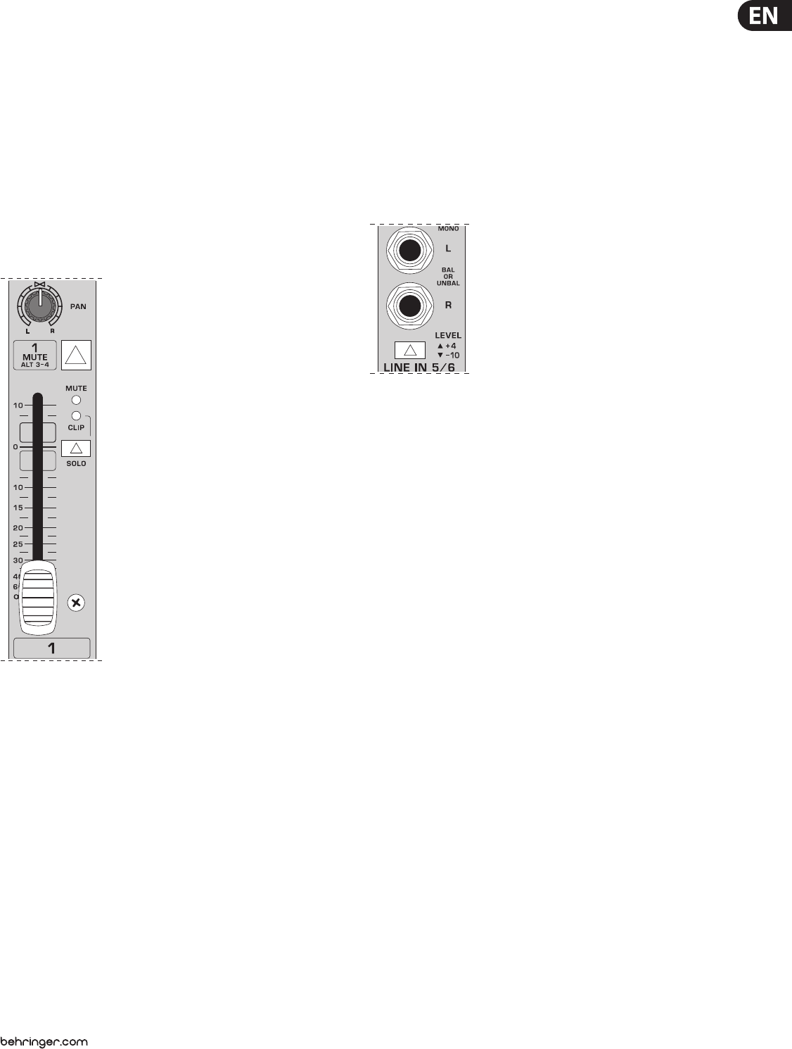 The MUTE/ALT 3-4 switch, the MUTE-LED, the CLIP-LED, the SOLO switch and the