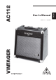 VINTAGER AC112 1. INTRODUCTION Thank you very much for expressing your confidence in BEHRINGER products by purchasing the VINTAGER AC112. With the VINTAGER, you have acquired a modern guitar workstation that sets new standards in guitar amp engineering. When developing the AC112, our top objective was to reproduce the authentic sound of classical guitar amps as perfectly as we could and combine it with latest DSP technology while focusing on a user interface that can be operated intuitively.
