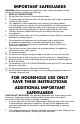 IMPORTANT SAFEGUARDS WARNING: When using electrical appliances, basic safety precautions should always be followed, including the following: 1. Read all instructions. 2. Do not touch hot surfaces. Use handles or knobs. 3. To protect against electrical shock, do not immerse cord, plugs or appliance in water or other liquid. 4.