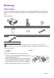Einleitung Lieferumfang Packen Sie den Inhalt vorsichtig aus und prüfen Sie, ob alle unten abgebildeten Teile vorhanden sind. Wenn von diesen Teilen etwas fehlt, wenden Sie sich an den Händler, bei dem Sie das Gerät gekauft haben. Standardzubehör Projektor Fernbedienung mit Batterien Benutzerhandbuch-CD Garantiekarte* Netzkabel Digital Quick Projector Start Guide Kurzanleitung VGA-Kabel • Das mitgelieferte Zubehör ist für Ihr Land geeignet und kann von dem abgebildeten Zubehör abweichen.