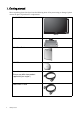 1. Getting started When unpacking please check you have the following items. If any are missing or damaged, please contact the place of purchase for a replacement. BenQ LCD Monitor Monitor Base Quick Start Guide CD-ROM Power Cord (Picture may differ from product supplied for your region.