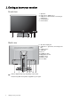 2. Getting to know your monitor Front view 1. Speakers 2. Light sensor / ECO sensor 3. USB port x 4 (downstream; connecting to USB device) 4. Control buttons 5. Power buttons 1 2 3 4 15 Back view 6. AC Power Input jack 7. USB port x 1 (upstream; connecting to the PC) 8. Height release 9. Cable clip 10.Line In 11. Headphone jack 12.DisplayPort socket 13.DVI-D socket 14.D-Sub socket 15.Lock switch 6 7 8 9 11 10 12 13 14 15 • Above diagram may vary depending on the model.