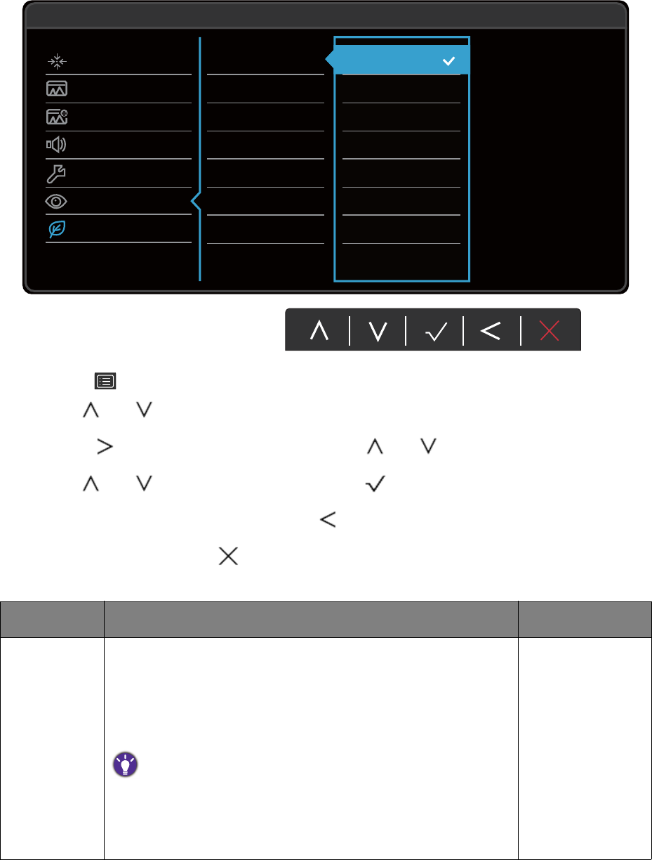 3. Select to go to a sub menu, and then use or to select a menu item.