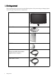 1. Getting started When unpacking please check you have the following items. If any are missing or damaged, please contact the place of purchase for a replacement. BenQ LCD Monitor Monitor Base Quick Start Guide CD-ROM Power Cord (Picture may differ from product supplied for your region.