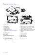 Projector exterior view 4 1 6 5 7 8 9 2 10 2 3 4 2 11 20 13 14 15 16 17 18 2 20 22 19 2 20 12 20 20 2 21 22 2 20 2 1. Lamp cover 12. RS-232 control port 2. Adjuster feet 13. USB Mini-B port (for firmware upgrades) 3. Projection lens 14. USB Type-A port (USB 3.0: 5V 1.5A media reader/drive, firmware download) 4. IR remote sensor 5. External control panel (See Controls and functions on page 9.) 15. HDMI 1/ HDMI 2 input port (Version 2.0b) 6. Lens shift wheel 16.