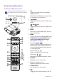 Controls and functions Projector & Remote control All the key presses described in this document are available on the remote control or projector. 1. OK Confirms the selected On-Screen Display (OSD) menu item. When Keystone OSD pops up, long pressing for 2 seconds to reset Keystone. 5 6 1 2 2. 3 Toggles the projector between standby mode and on. 7 4 POWER ON/ Off Toggles the projector between standby mode and on. 3. BACK Goes back to previous OSD menu, exits and saves menu settings. 4.
