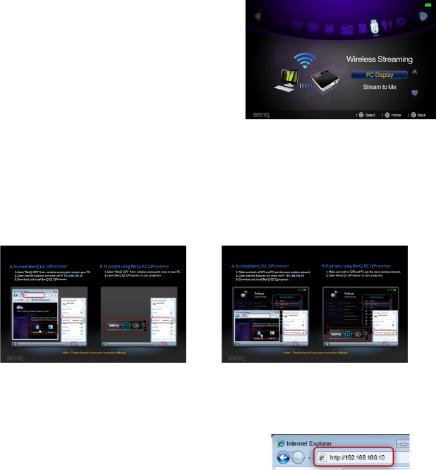 project images wirelessly. One is PC Display; the other is Stream to me.