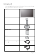 Getting started When unpacking please check you have the following items. If any are missing or damaged, please contact the place of purchase for a replacement. BenQ LCD Monitor Monitor Stand Monitor Base Quick Start Guide CD-ROM Power Cord (Picture may differ from product supplied for your region.
