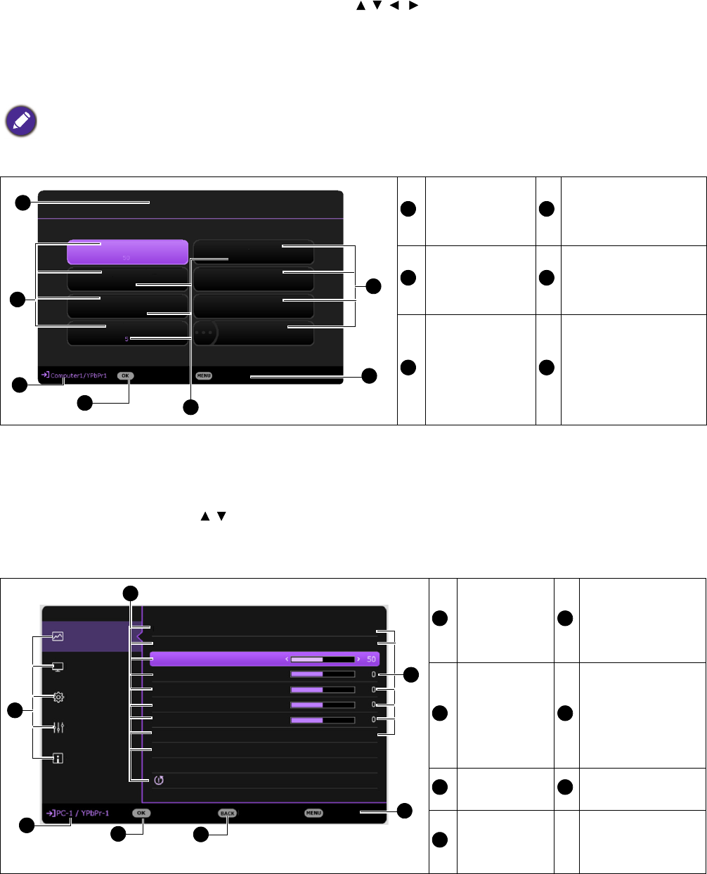 De projector beschikt over 2 soorten schermmenu's (OSD) waarin u de instellingen kunt aanpassen.