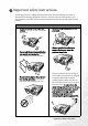 Safety instructions (continued) 11. Do not step on the projector or place any objects upon it. Besides probable physical damage to the projector, doing so may result in accidents and possible injury. 12. 4 Do not block the projection lens with any objects when the projector is under operation as this could cause the objects to become heated or deformed or even cause a fire. To temporarily turn off the lamp, press Blank on the projector or remote control. Important safety instructions 13.