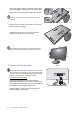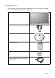 Getting started When unpacking please check you have the following items. If any are missing or damaged, please contact the place of purchase for a replacement. BenQ LCD Monitor Monitor Stand Monitor Base Quick Start Guide CD-ROM Power Cord (Picture may differ from product supplied for your region.
