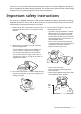 Projector exterior view Front and upper side view 1 2 5 3 6 7 8 4 9 Rear and lower side view See "Connecting with video equipment" on page 21 for connection details. 10 11 12 13 19 20 21 22 18 21 22 22 21 21 12 14 15 16 17 Important safety instructions 1. Control panel (See "Control panel" on page 13 for details.) 2. Lamp cover 3. Vent 4. Lens cap 5. Lens shift cover 6. Focus and Zoom ring 7. Vent 8. Front IR sensor 9. Projection lens 10. HDMI ports 11.