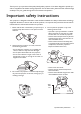 Table of contents Important safety instructions.......3 Overview..........................................6 Shipping contents...................................... 6 Standard accessories..................................... 6 Optional accessories..................................... 6 Replacing the remote control batteries...................................................... 7 Remote control effective range ............ 7 Projector features .................................... 9 Projector exterior view ..