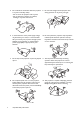 2. Loosen the screw that secures the lamp cover on the side of the projector until lamp cover loosens. 3. Remove lamp cover from the projector. • Do not turn on the power with lamp cover removed. • Do not insert your fingers between the lamp and the projector. The sharp edges inside the projector may cause injuries. 1 2 4. Loosen the screw that secures the lamp. 5. Lift the handle upward. 6. Shift lamp housing slightly to the left to allow space for the whole lamp housing, as illustrated.