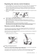 Replacing the remote control batteries 1. To open the battery cover, turn the remote control over to view its back, push on the finger grip on the cover and slide it up in the direction of the arrow as illustrated. The cover will slide off. 2. Remove any existing batteries (if necessary) and install two AAA batteries observing the battery polarities as indicated in the base of the battery compartment. Positive (+) goes to positive and negative (-) goes to negative. 3.