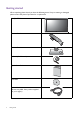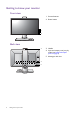 Getting started When unpacking please check you have the following items. If any are missing or damaged, please contact the place of purchase for a replacement. BenQ LCD Monitor Monitor Stand Monitor Base S Switch (Swift Switch) Quick Start Guide CD-ROM Power Cord (Picture may differ from product supplied for your region.
