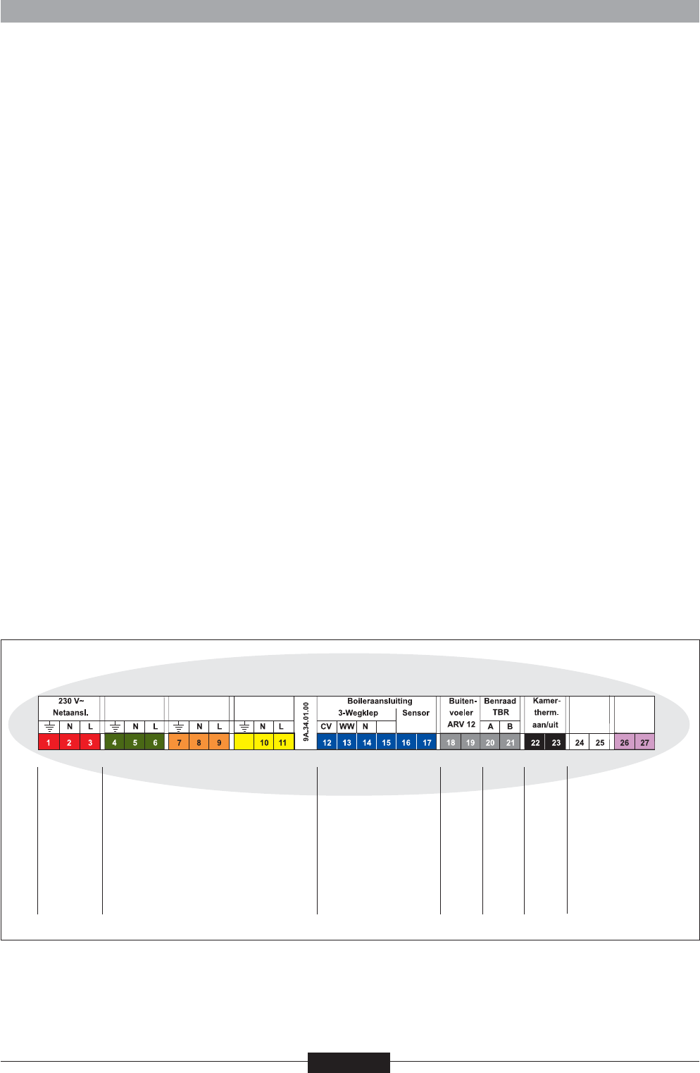 De Benraad TBR kamerthermostaat moet op de hiervoor bestemde aansluitingen worden aangesloten. Alle overige