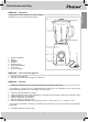 Mode d’emploi Fonctionnement - Généralités L’appareil est destiné uniquement à l’utilisation domestique, et non à l’usage professionnel. 3. 2. 1. 4. 6. 1. 2. 3. 4. 5. 6. 7. 8. Bol mélangeur en verre Couvercle Couvercle de remplissage Lames Bloc moteur Bouton de réglage de la vitesse Bouton Turbo Cordon et fiche 8. 7. fonctionement - Avant la première utilisation 1. Enlevez l’emballage. 2. Nettoyez l’appareil. Voir ‘Nettoyage et entretien’. Fonctionnement - Utilisation 1.
