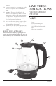 chaude qu’avec d’extrêmes précautions. Ne jamais soulever la bouilloire par son couvercle. Toujours utiliser la poignée du corps de l’appareil. 17. Ne pas mettre la bouilloire sous tension quand elle est vide. 18. Pour prévenir les dangers de choc électrique, ne pas immerger cette bouilloire, sa base ou son cordon d’alimentation dans un liquide quel qu’il soit. 19. Utiliser cette bouilloire uniquement avec l’unité de base fournie. Ne pas utiliser l’unité de base pour d’autres usages. 22.