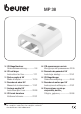 MP 38 D UV-Nageltrockner Gebrauchsanweisung............... 2-6 G UV nail dryer Instruction for Use.................. 7-11 F Sèche-ongles à UV Mode d’emploi...................... 12-16 E Secador de uñas UV Manual de instrucciones...... 17-21 I Asciuga unghie UV Instruzioni per l’uso.............. 22-26 T UV tırnak kurutucu Kullanım kılavuzu.................. 27-31 r УФ-сушилка для ногтей Инструкция по применению...32-36 Q Suszarka do paznokci UV Instrukcja obsługi.................