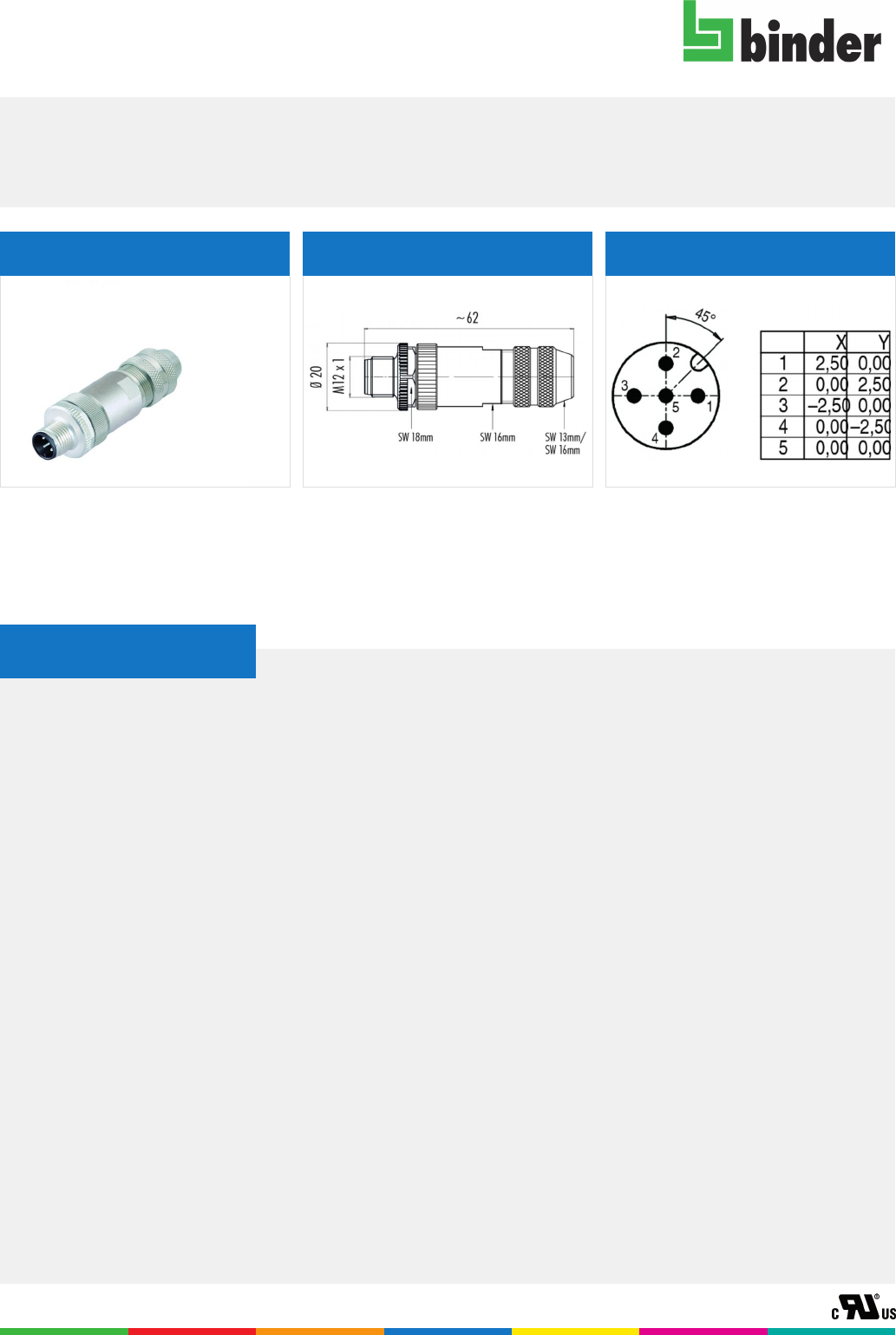 Bezeichnung M12-A Kabelstecker, Polzahl: 5, 6.0 - 8.0 mm, schirmbar, schraubklemm, IP67, UL