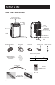 CONFIGURATION ET UTILISATION PIÈCES & CARACTÉRISTIQUES Panneau De Commande et Capteur De Télécommande Grille de sortie d’air Filtre Poignées Boîtier de tuyau d’échappement d’air Grille d’entrée Drain de condensation Roulettes (4) Prise de courant Tuyau D’échappement D’air Sortie De Tuyau Entrée De Tuyau Serrures De Roulette Vis De Verrouillage En Métal Vis De Verrouillage En Métal Support de fenêtre / Connecteur De Tuyau D’échappement D’air Drip Pan Support de fenêtre Tuyau de vidange Télécommande
