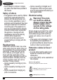 ITALIANO (Traduzione del testo originale) Utilizzo dell'elettrodomestico Non puntare il getto di vapore verso persone, animali, apparecchiature elettriche o prese di corrente. Non esporre l’elettrodomestico alla pioggia. Non immergere l'elettrodomestico in acqua. Non lasciare l’elettrodomestico incusIstruzioni di sicurezza todito. Attenzione! Leggere Non lasciare l’elettrodomestico col@ tutti gli avvisi di siculegato a una presa di corrente quando rezza e tutte le istruzinon è usato. oni.