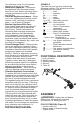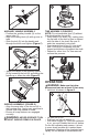 B E 6 TINE ASSEMBLY (FIGURE F) NOTE: Do not assemble tines (5) without first attaching the shroud (4). • Place tine (5) on shaft (10), making sure the flat side of the hole of tine is aligned with flat side of the shaft. Be sure to push tine completely onto shaft. • Insert straight end of pin (11) into shaft hole. Push in pin completely until the looped end bottoms out against the shaft. • Repeat for other tine. For tine removal reverse the process.