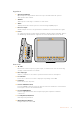 Left Panel 2 4 5 6 3 7 8 2 HDMI Out The HDMI output lets you preview your video output and navigate the camera menus using external monitors such as Blackmagic Video Assist. Output resolution is always 1080HD, unless you have 720p selected, in which case the output resolution will also be 720p. You can choose to display overlays such as frame guides, a histogram, and audio levels. See the ‘monitoring settings’ section in this manual for more details. 3 Expansion Port DB-HD15 connector.