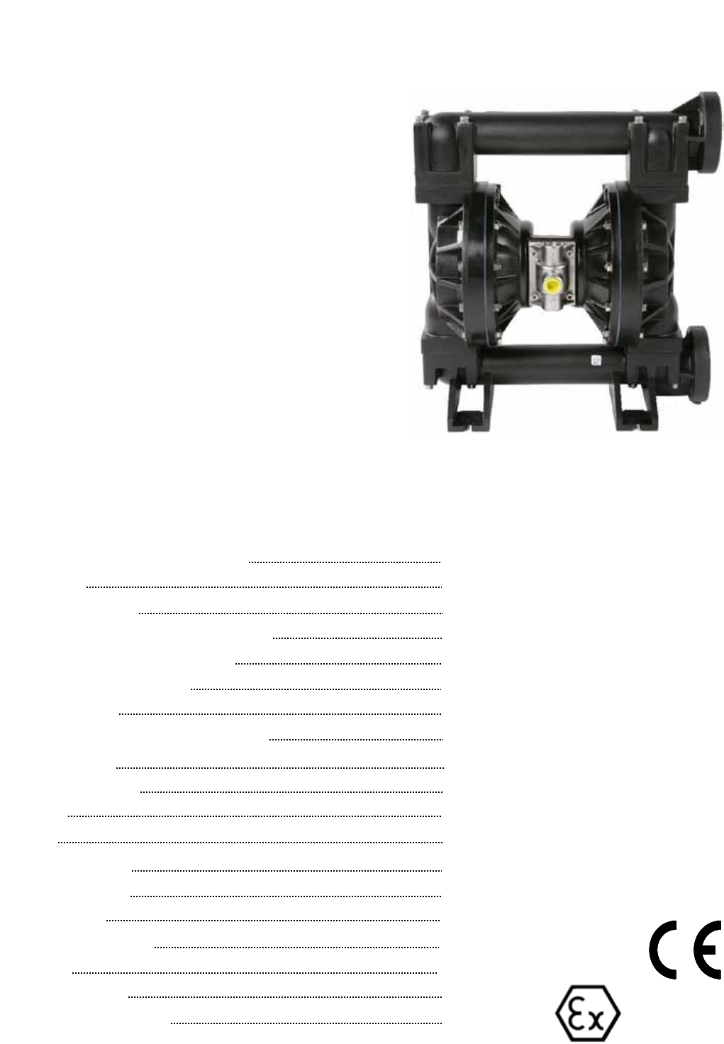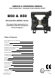 SERVICE & OPERATING MANUAL AIR OPERATED DOUBLE DIAPHRAGM PUMP B50 & X50 Moulded Non-Metallic Series This pump is Atex approved for use in potentially explosive atmospheres Group II category 2 Table of Contents Service / Maintenance Log, Recycling 2 Dimensions 3 Performance Curve 3 Technical Data & Temperature limitations 4 Explanation of Pump Nomenclature 4 Principle of Pump Operation 5 Installation guide 5 Important Warnings & Safety Information 6 Troubleshooting 7 Grounding the Pump 7