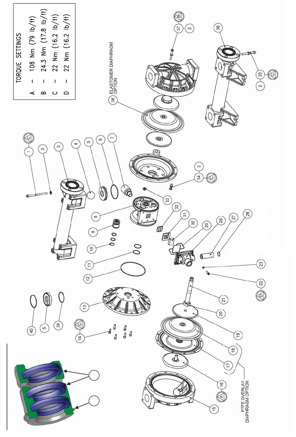 Exploded View Assembly :- B50 Non-Metallic Pump, refer to Parts List table for item Ref. Nos.
