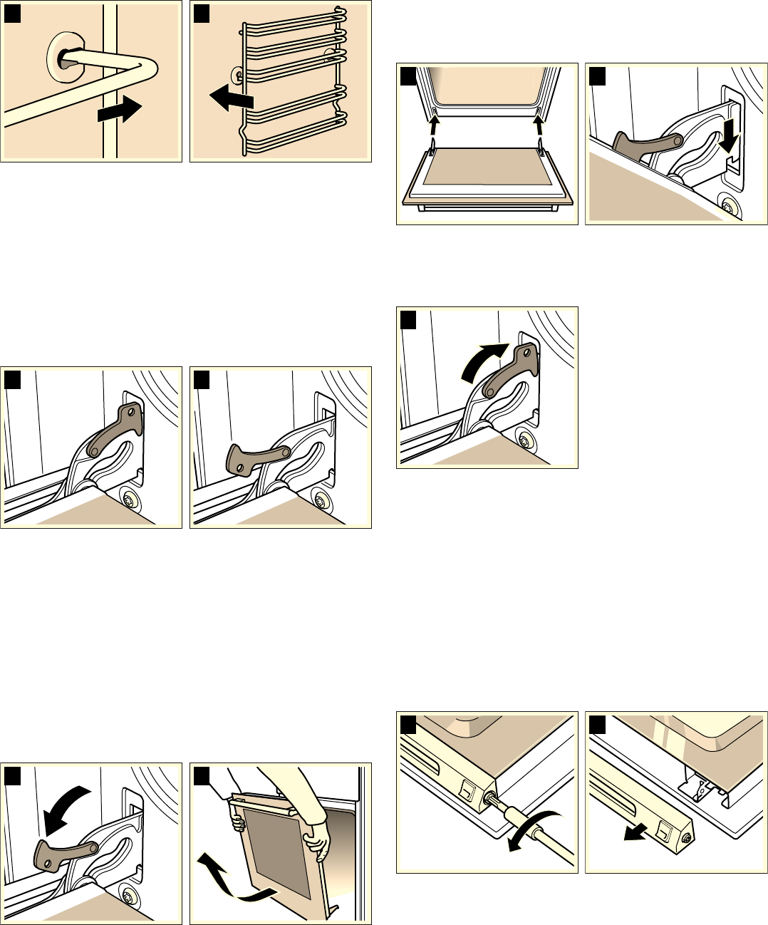 - 1. Backofentür aushängen und mit dem Griff nach unten auf ein Tuch legen.