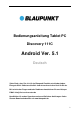 Bedienungsanleitung Tablet PC Discovery 111C Android Ver. 5.1 Deutsch Vielen Dank, dass Sie sich für ein Blaupunkt Produkt entschieden haben. Eine gute Wahl. Selbstverständlich sind wir auch nach dem Kauf für Sie da. Bei technischen Fragen und/oder Problemen kontaktieren Sie uns bitte per E-Mail: info@first-servicecenter.de Handbücher für andere Sprachen sowie ausführlichere Anleitungen finden Sie zum Download ebenfalls auf www.blaupunkt.