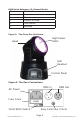 DMX Quick Reference (5-Channel Mode) Channel What It Does 1 Pan 2 Tilt 3 Dimmer & Strobe 4 Color Macros 5 Reserved Figure 1: The Flurry Pin-Up Picture High Power LED’s Head LED Readout Control Panel Figure 2: The Rear Connections DMX In AC Power DMX Out Fuse Cover 110V/220V Switch Flurry TRI Manual Rev.