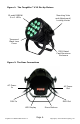 Figure 1: The ToughPar™ V12 Pin-Up Picture 15-watt RGBVW 5-in-1 LEDs Mounting Yoke and Adjustment/ Locking Knobs Tempered Glass Lens Cover IP65-Rated Cast Aluminum Enclosure Figure 2: The Rear Connections AC Power In AC Power Out DMX In DMX Out LED Display Menu Buttons Page 6 ToughPar V12 RGBVW Manual Rev.