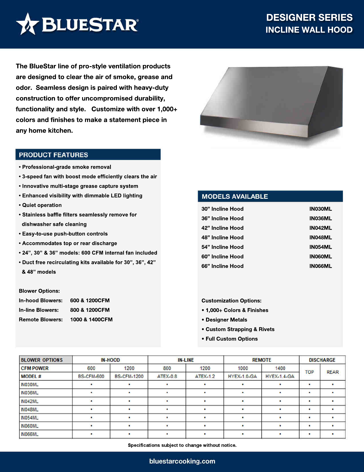 bg = 00130 Nd EY The Blue Star line of pro-style ventilation products are designed to clear the air of smoke, grease and odor. Seamless design is paired with heavy-duty construction to offer uncompromising durability, functionality and style. Customize with over 1,000+ colors and finishes to make a statement piece in any home kitchen.