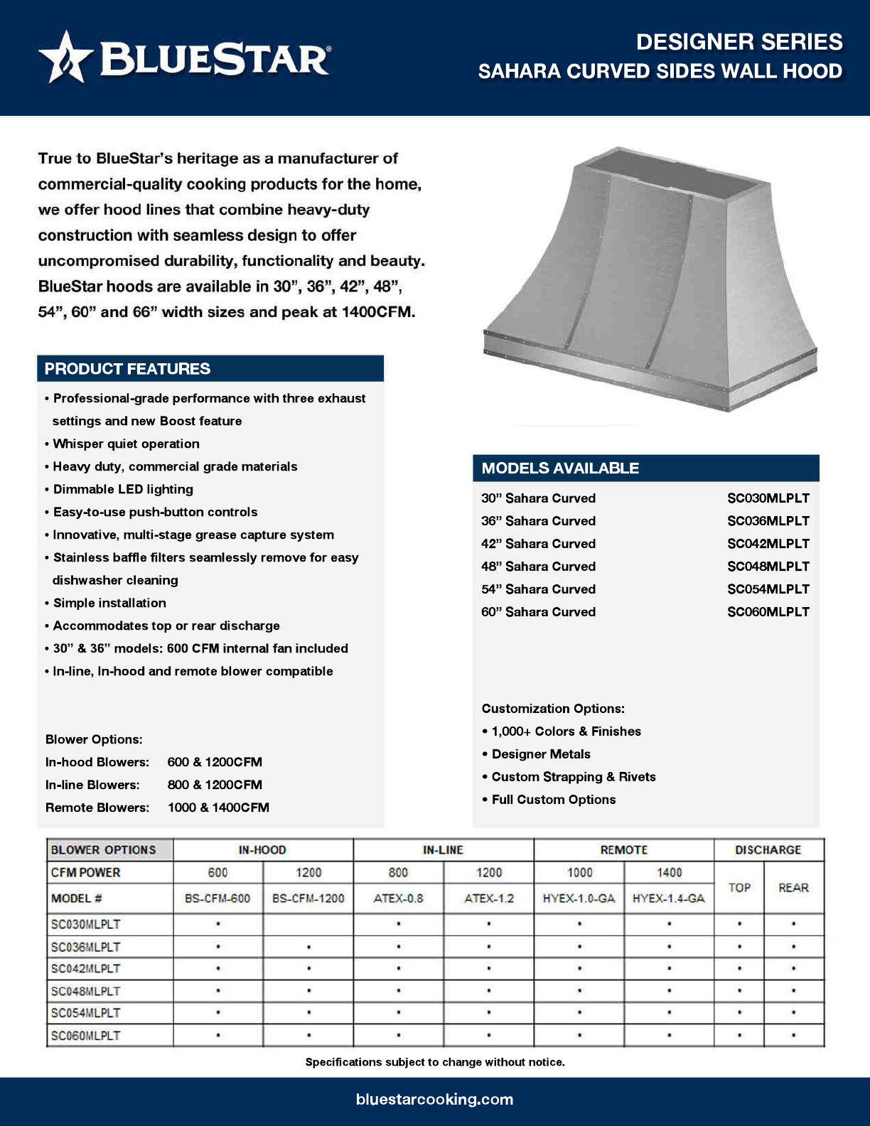 big = BUSTS FO pp Rife to Blue Star's heritage as a manufacturer of commercial-guality cooking products for the home; we offer hood lines that combine heavy-duty constriction with seamless design io offer uncompromising durability, functionality and beauty. Blue Star hoods are available in 307 367, 427,487 BAY, 60" and 66" width sires and peak at 1A00CFM.