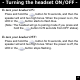 - Turning the headset ON/OFF To turn your headset ON: Press and hold the button for 3 seconds, and then the speaker will emit two high tones. When the power is on, the button starts to flash blue. LED in the (Note: The headset will go to pairing mode if you press and button for 5 seconds from OFF status) hold the To turn your headset OFF: Press and hold the button for 3 seconds, and then the speaker will emit two high tones. When the power is off, the LED in the button stops flashing.