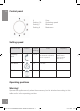EN Control panel 0 Setting 1-6 Setting 1 Setting 6 Stop Operating speed Minimum Maximum Speed setting Time Setting speed Accessories Picture Kneading Hook 1, 2, 4 30 seconds at speed 1, 30 seconds at speed 2, 4min at speed 4 Flat beater 1-5 10 min Whisk 6 10 min Capacity 700 g flour and 350ml water (Temperature 40+/-5 °C) Operating positions Warning! Operate the appliance only when the accessory/tool is attached according to this table and is in the operating position.