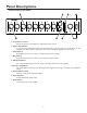 Panel Descriptions Power Vector Front Panel 1. Input Volume Control Each of the 8 inputs is controlled by an independent volume control. 2. Signal / Clip Indicator A single two-color LED located above each channel’s volume control indicates the audio activity of that channel’s input. Green indicates signal present at the input; red indicates clipping of the input signal. 3.Treble Control Controls the amount of cut or boost of treble frequencies above 10 kHz. 4.