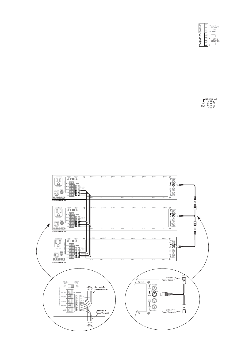 Using the bridging RCA connector, it is possible to connect two or more Power Vector amplifiers. It is not